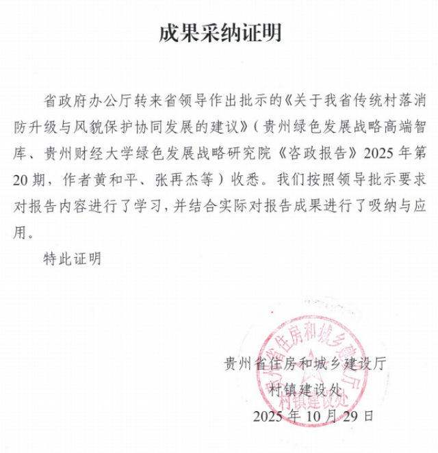 近日,由主播视频 黄和平教授和贵州财经大学张再杰研究员等合作撰写的研究报告《关于我省传统村落消防消防升级与风貌保护协同发展的建议》获贵州省政府分管领导肯定性批示。该报告刊发于贵州绿色发展战略高端智库、贵州财经大学绿色发展战略研究院主办的《咨政报告》2025年第20期。贵州省住房和城乡建设厅村镇建设处已按领导批示要求对报告内容进行了学习,并结合实际对报告成果进行了吸纳和应用。