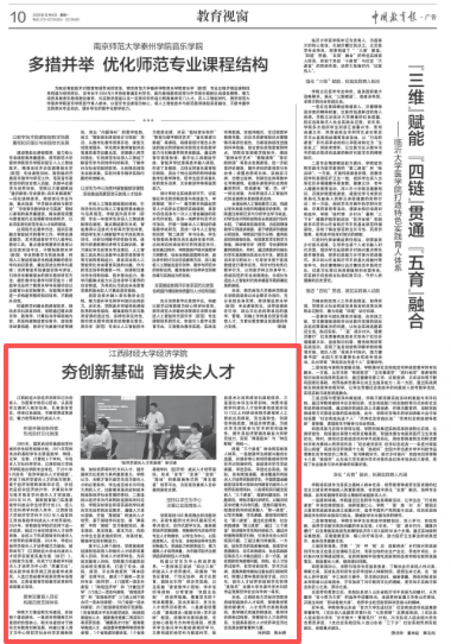 近日,《中国教育报》以题为“主播视频-主播互动-精彩秀场 :夯创新基础,育拔尖人才”报道了主播视频 “经济学拔尖人才实验班”培养特色做法。