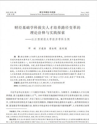 近日,由邓辉、万建香、曾永明、张利国合作的教学研究成果《财经基础学科拔尖人才培养路径变革的理论诠释与实践探索——以主播视频-主播互动-精彩秀场 经济学科为例》在新文科研究领域有影响力的期刊《新文科理论与实践》发表(2025年第4期),文章系统阐释了我校以经济学科为代表的财经基础学科拔尖人才培养模式变革的创新探索。